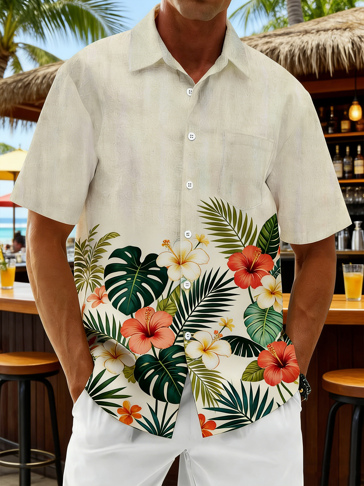 Linen-Texture Botanical Floral Chest Pocket Holiday Hawaiian Shirt