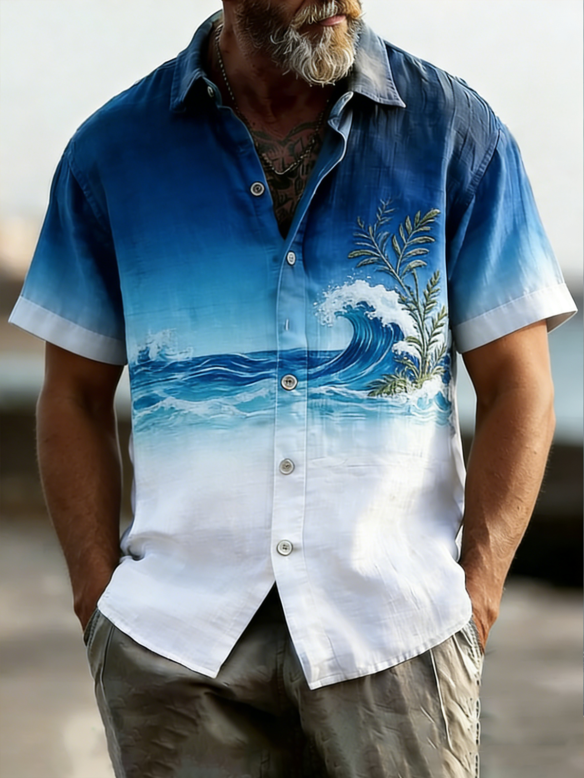 Linen Texture Gradient Ocean Wave Plant Chest Pocke Holiday Hawaiian Shirt
