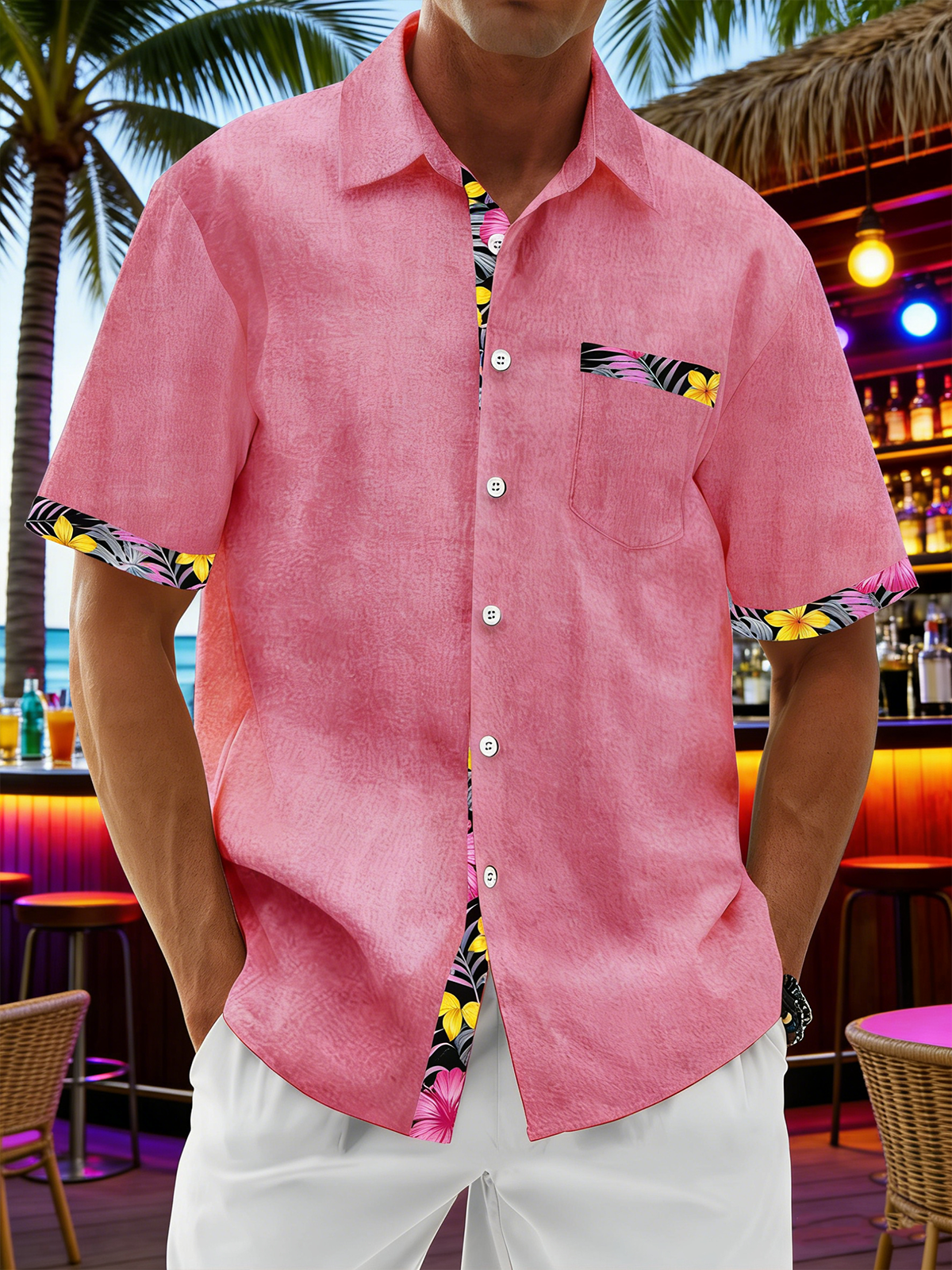 Linen Textured Floral Patchwork Chest Pocke Holiday Hawaiian Shirt
