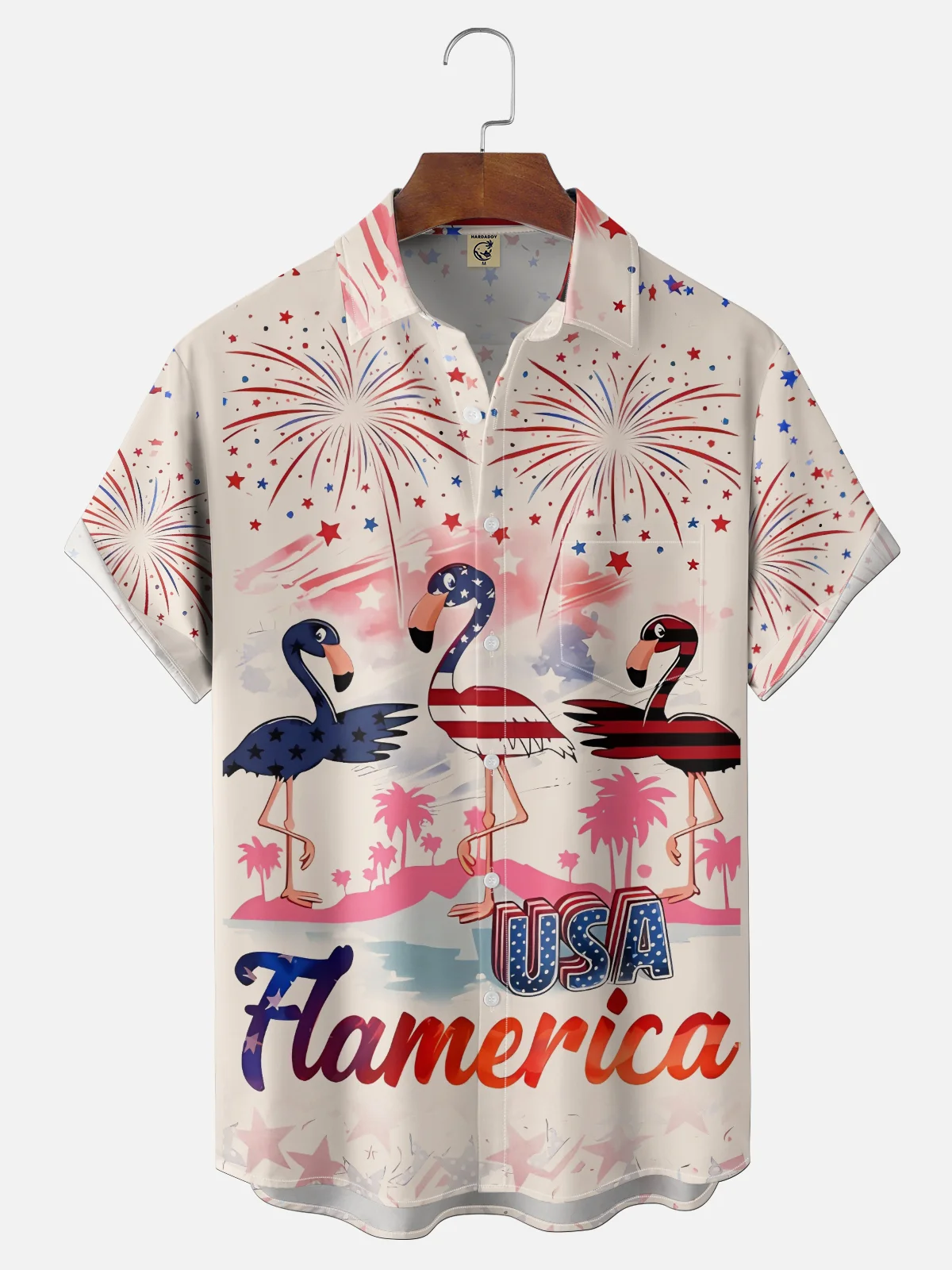 Moisture Wicking American Flag Flamingo Fireworks Chest Pocket Holiday Shirt
