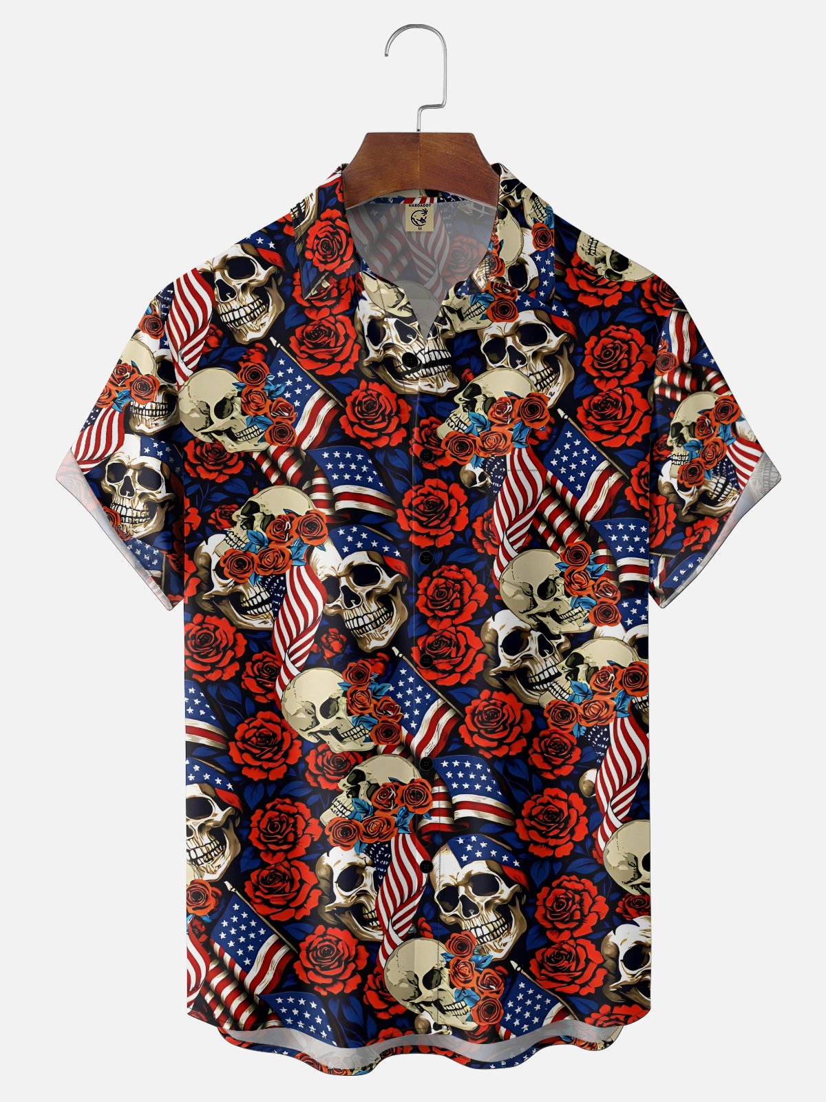 Moisture Wicking American Flag Red Rose Skull and Cranny Chest Pocket Holiday Shirt