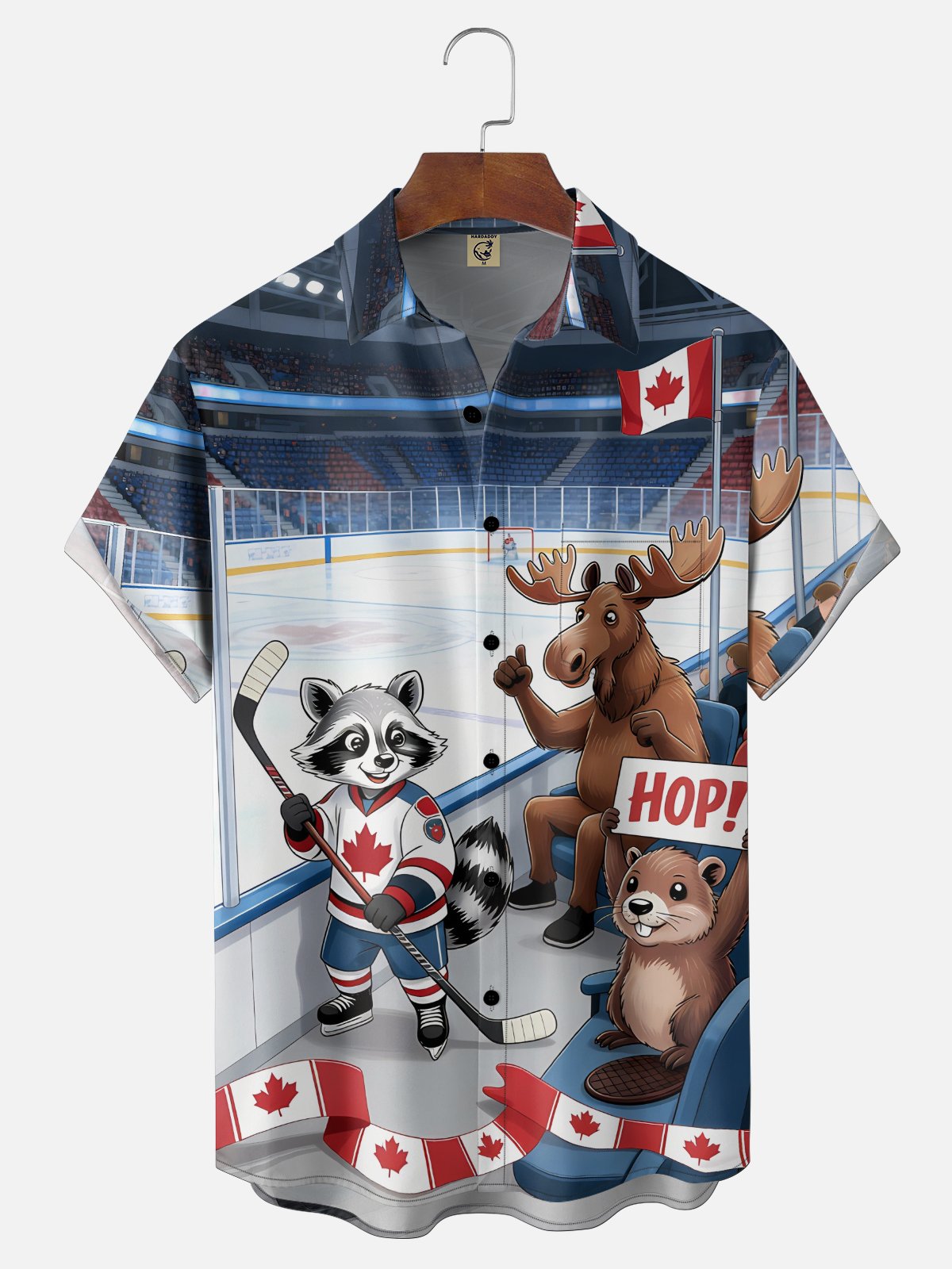 Moisture Wicking Canadian Heritage Themed Maple Leaf Flag Hockey Beaver Moose Motifs Chest Pocket Hawaiian Shirt
