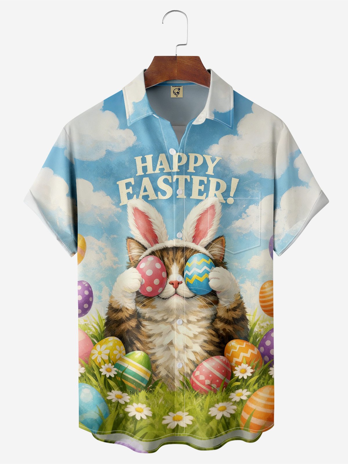 Moisture-wicking Easter Cat Bunny Eggs Chest Pocket Casual Shirt