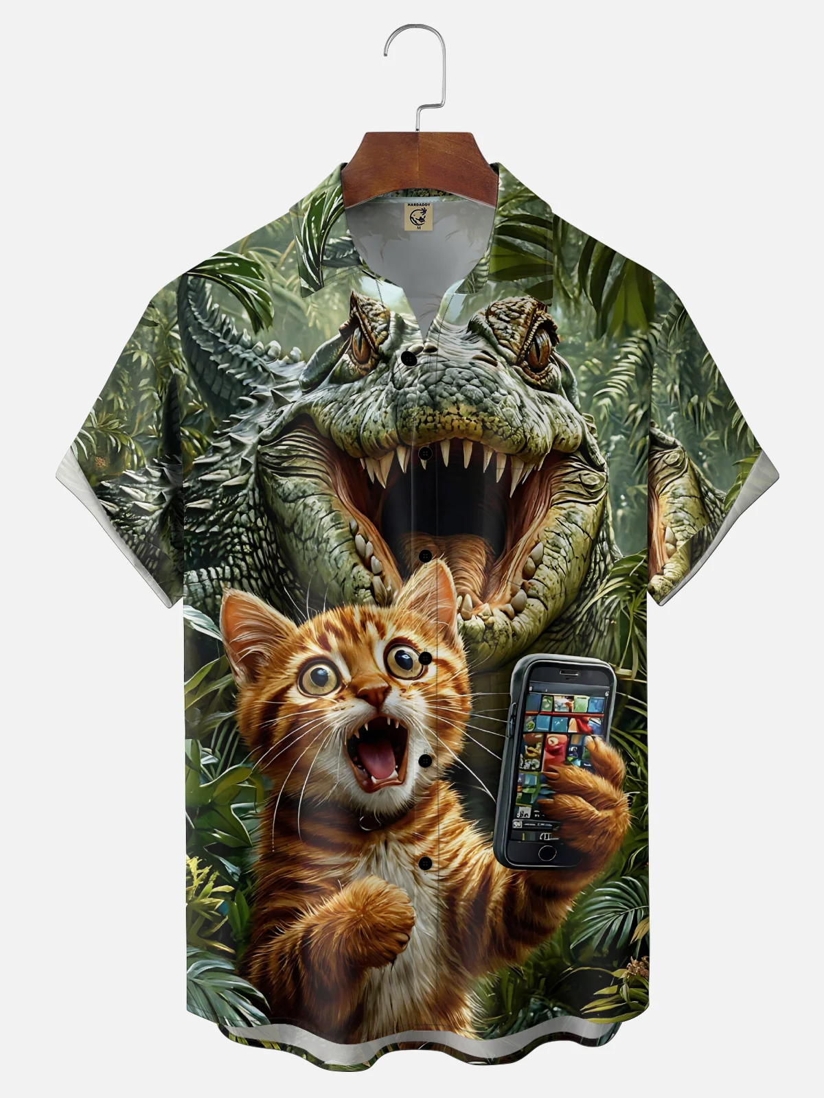 Moisture Wicking Fun Cat and Crocodile Chest Pocket Holiday Hawaiian Shirt