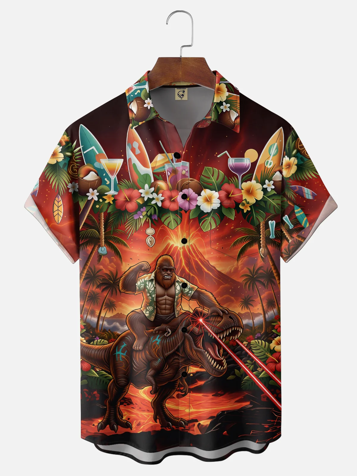 Moisture-Wicking Gradient Volcano Bigfoot Dinosaur Floral & Cocktail Patterns Chest Pocket Hawaiian Shirt