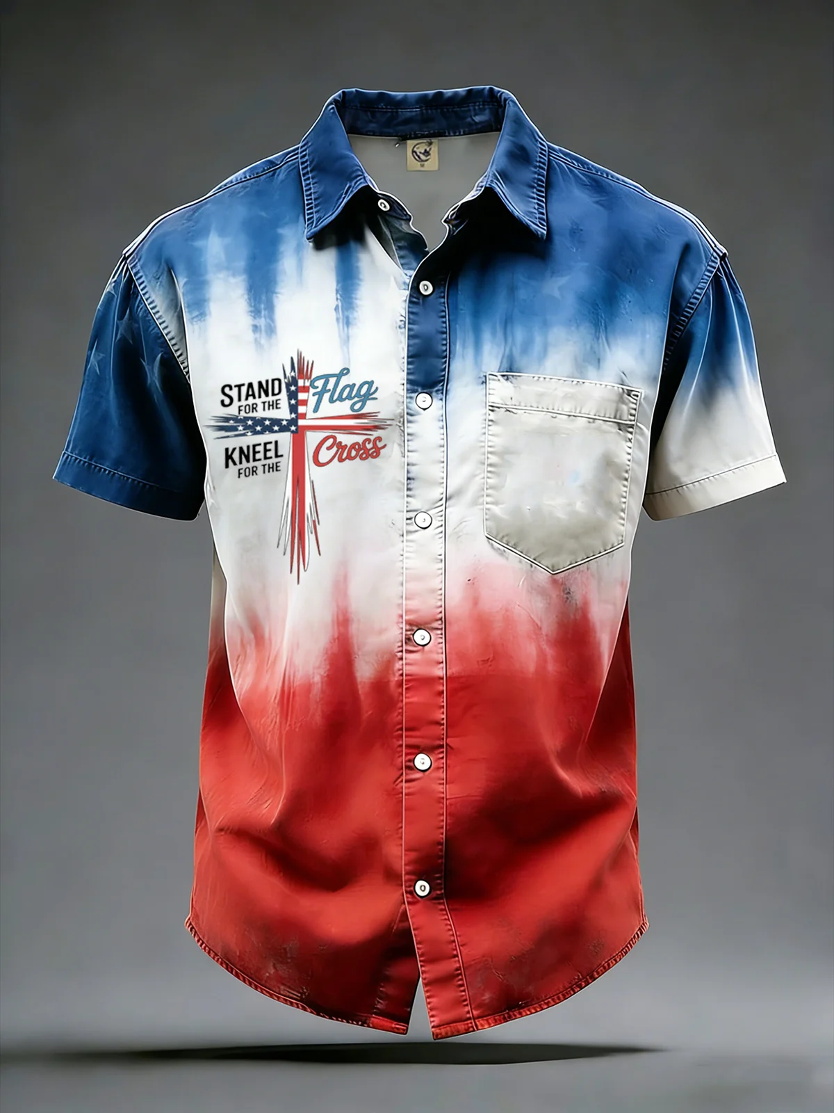 Moisture-Wicking Independence Day American Flag, "God Bless" Slogan Chest Pocket Hawaiian Shirt