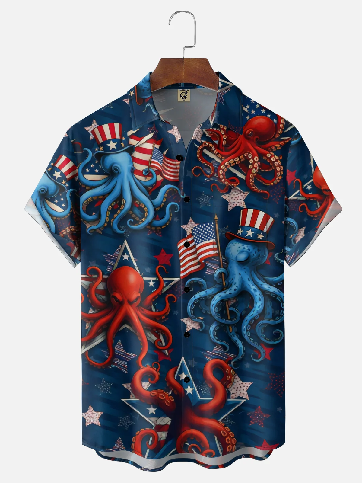 Moisture Wicking Independence Day American Flag Octopus Chest Pocket Holiday Shirt