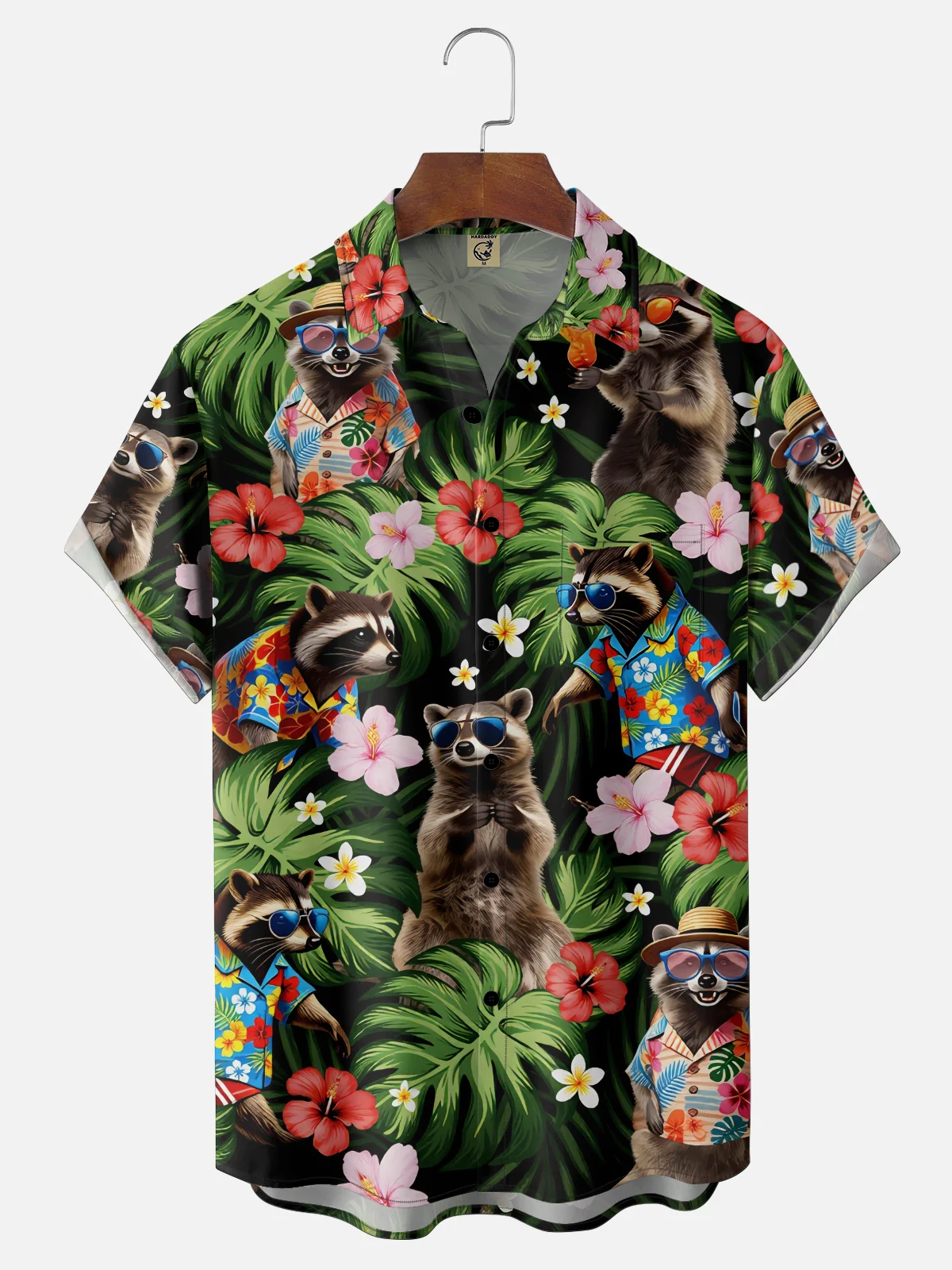Moisture Wicking Leaf Floral and Raccoon Chest Pocket Holiday Hawaiian Shirt