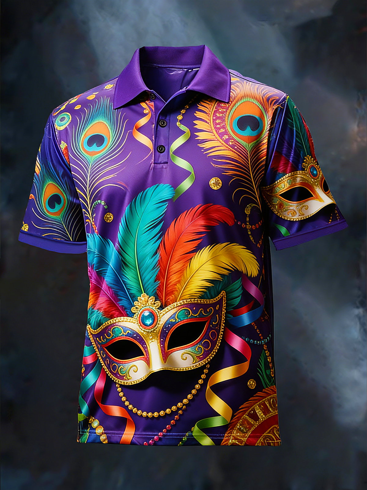 Moisture-Wicking Mardi Gras Feather Mask Short Sleeve Golf Polo