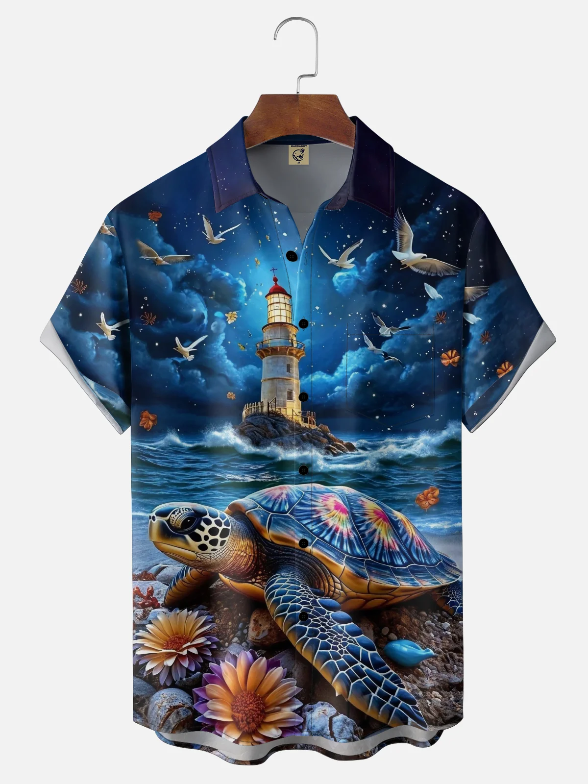 Moisture-wicking Ocean Turtle Flower Lighthouse Chest Pocket Hawaiian Shirt
