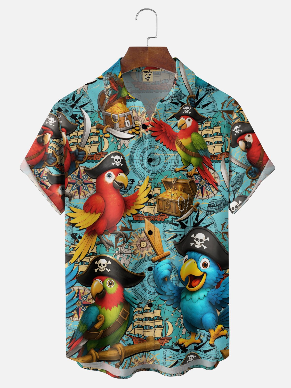 Moisture Wicking Pirate Parrot Sailboat Map Chest Pocket Holiday Shirt