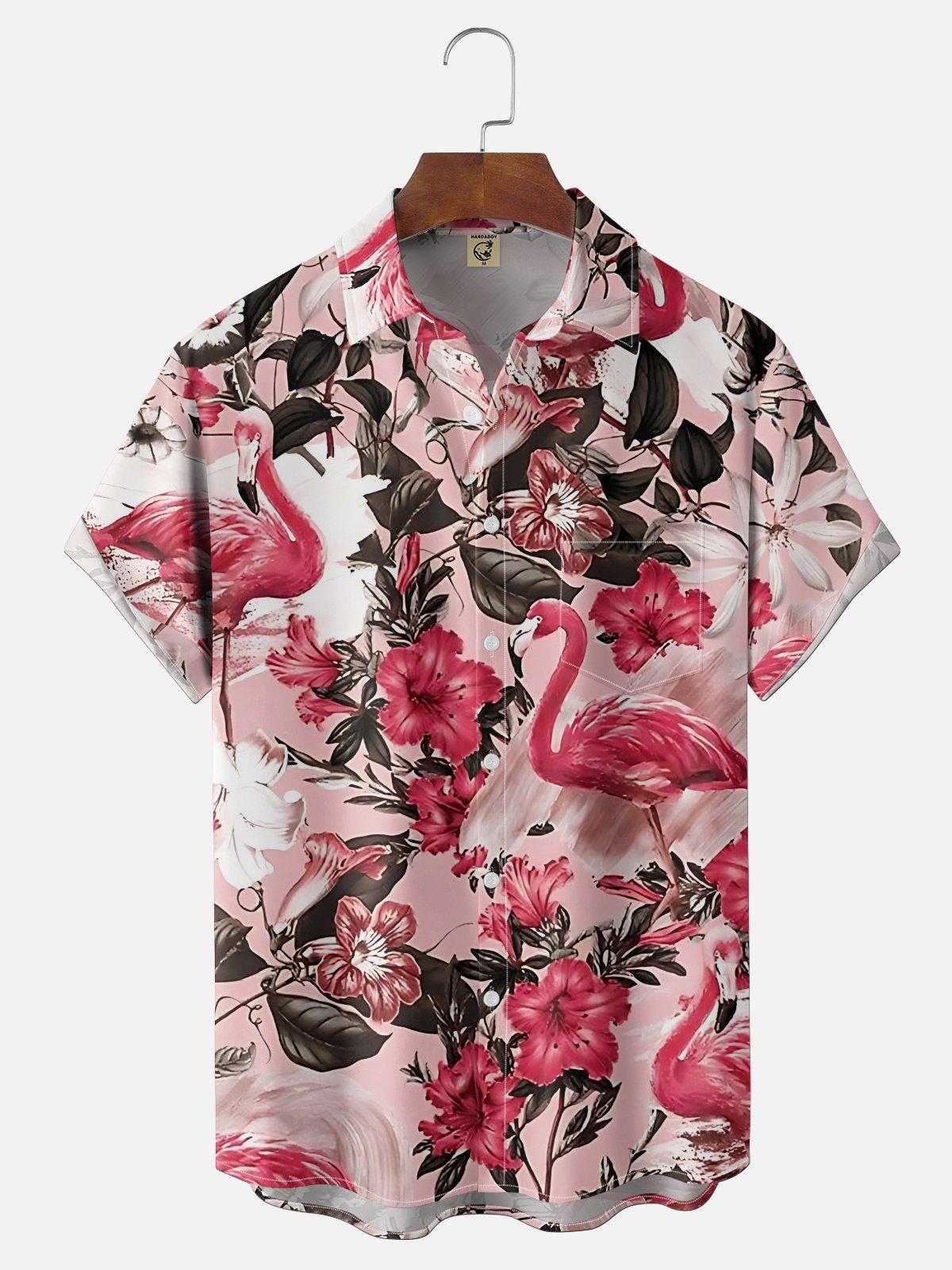 Moisture-wicking Plant Flamingo Art Chest Pocket Hawaiian Shirt