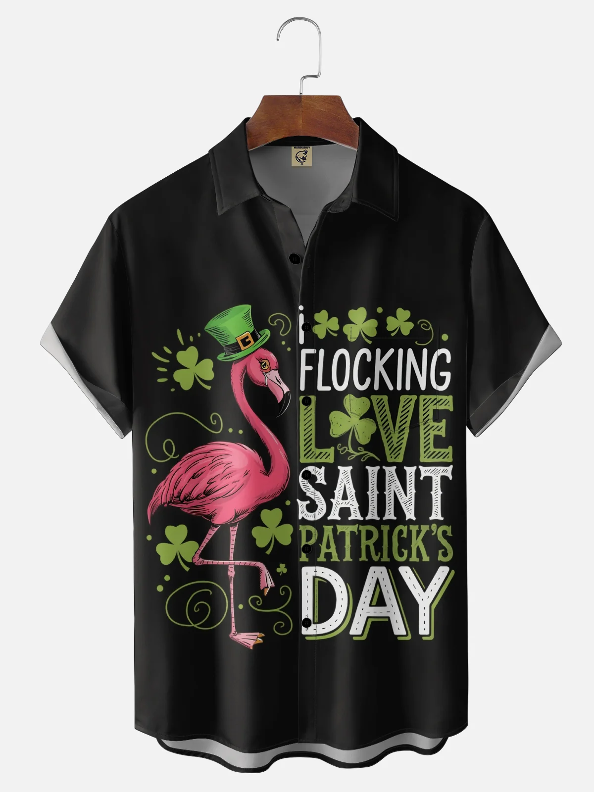 Moisture-Wicking St. Patrick's Day Shamrock Text Letter Flamingo Chest Pocket Holiday Shirt