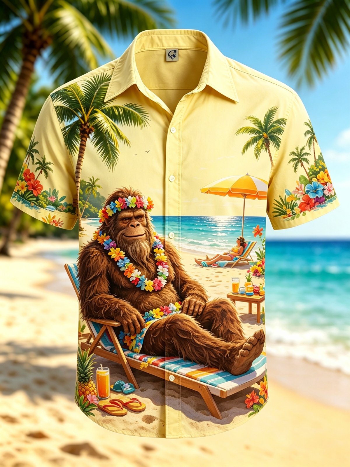 Moisture-Wicking Tropical Plants Beach And Bigfoot Print Chest Pocket Hawaiian Shirt