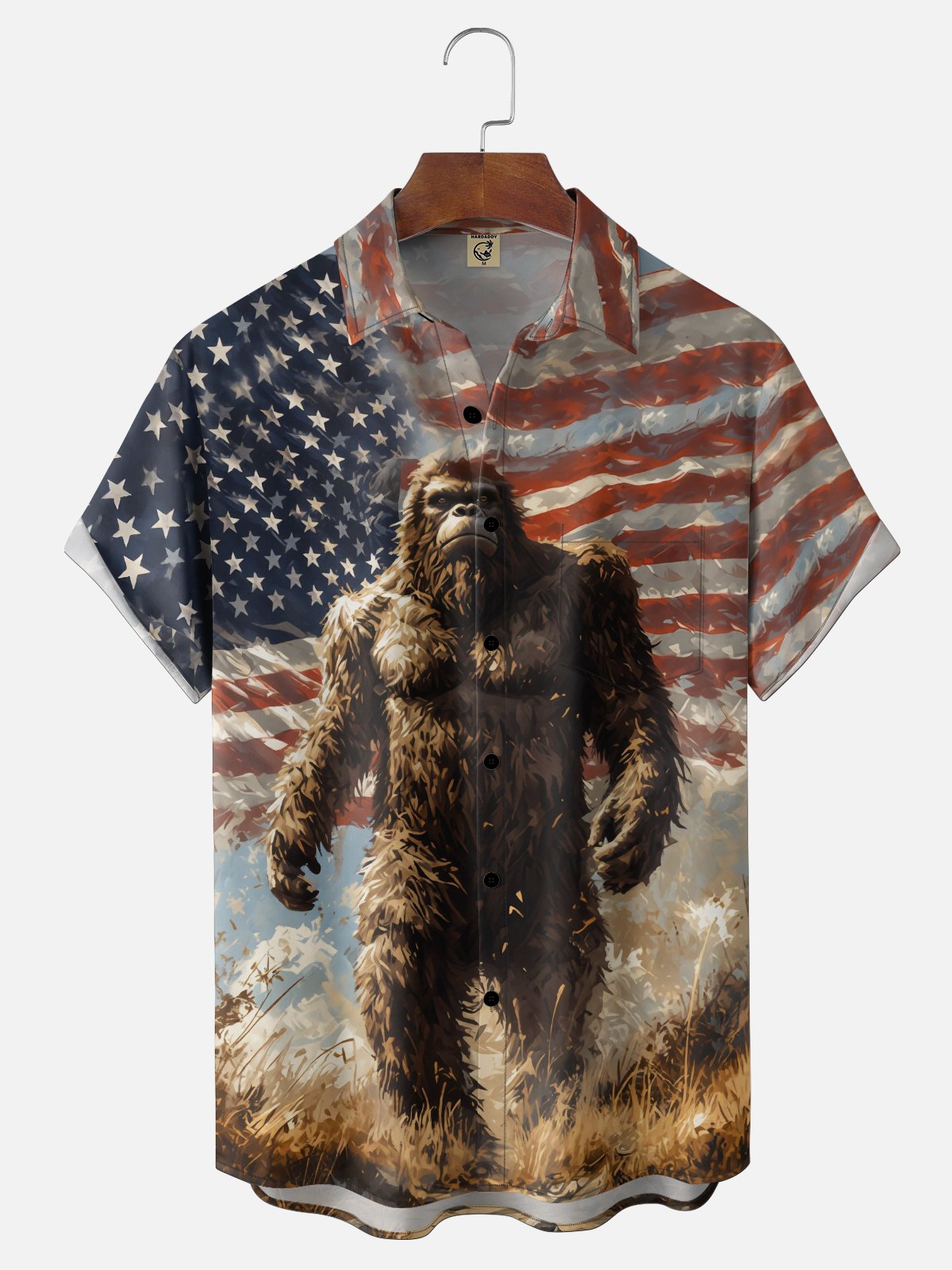 Moisture-Wicking US Flag Bigfoot Chest Pocket Holiday Hawaiian Shirt