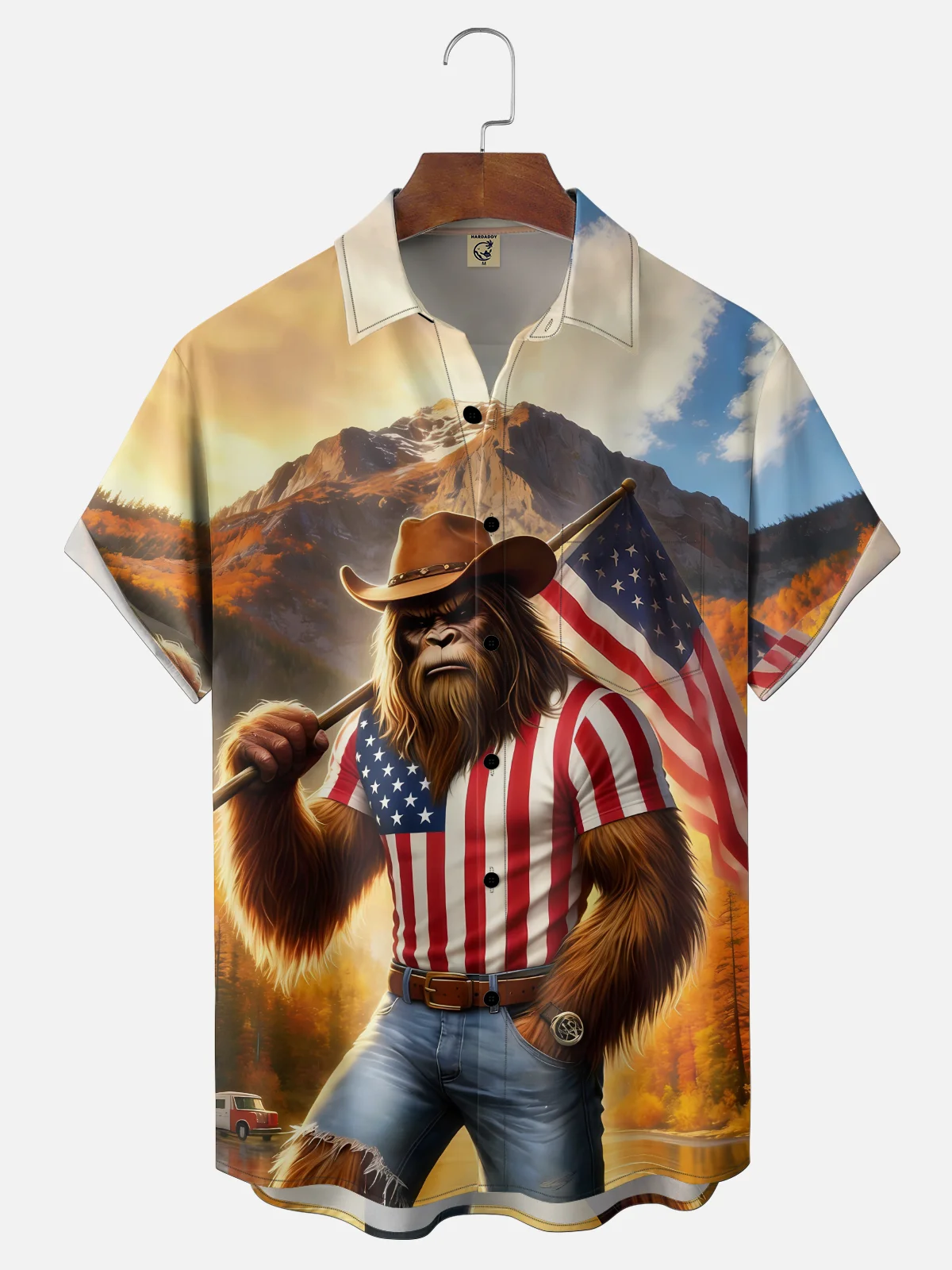 Moisture Wicking American Flag Bigfoot Chest Pocket Holiday Hawaiian Shirt